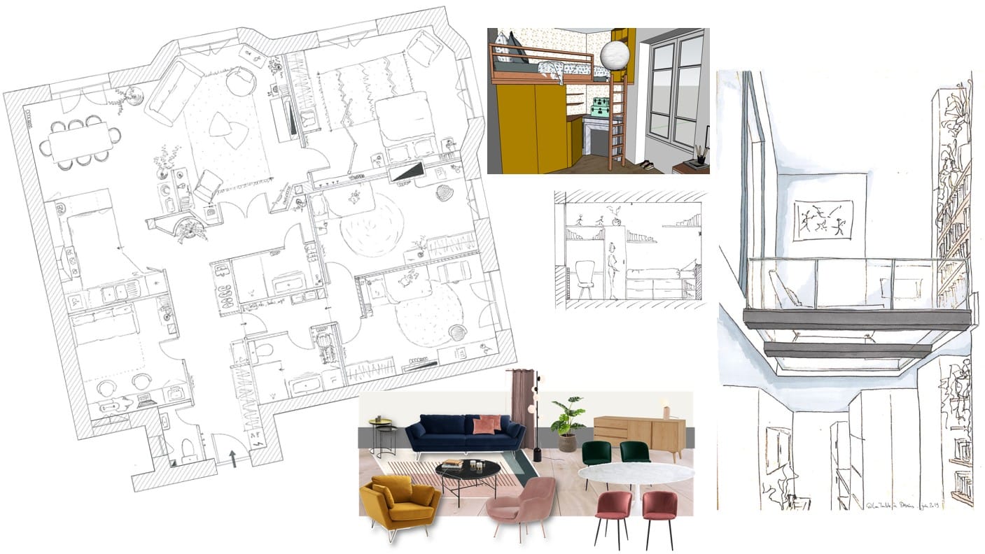 Pêle-mêle de livrables client d’étude d’aménagement d’intérieur : plan avant-projet détaillé côté (APD), esquisse couleur d’aide à la projection dans l’espace, vues 3D